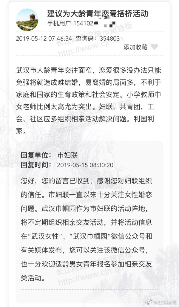 2月23日,武汉市新洲区回复留言表示:“经阳逻街核实,根据我国《婚姻法》相关规定婚姻自由,禁止包办婚姻,建议您平时多与异性接触,大胆追求,或者通过亲戚朋友介绍,或者通过正规的婚姻中介、婚恋网站相亲。”
